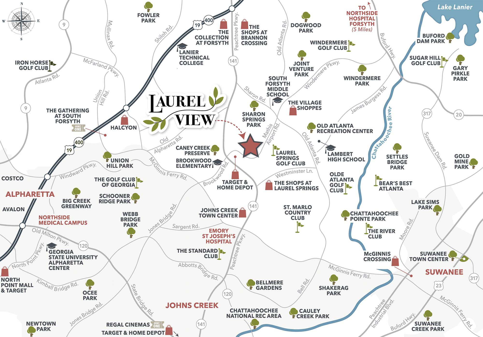 In addition to creating a local atmosphere of quiet comfort and sophistication, Laurel View is intended to provide its residents with easy access to all of the many dining, shopping, and entertainment options available in the ‘SoFo’ area. Laurel View’s strategic location gives its residents prime access to the heart of South Forsyth’s growing commercial landscape. Halcyon, with its plethora of retail, food, and entertainment options is just 5 miles from Laurel View. Other attractions such as the Gathering at South Forsyth, Big Creek Greenway Trailhead, and the Suwanee City Center are also close at hand. And, domestic conveniences such as Target, Home Depot, and Walmart are less than one mile away. Laurel View is ideally situated amongst top-rated schools, offering families access to some of the best educational opportunities in the county.